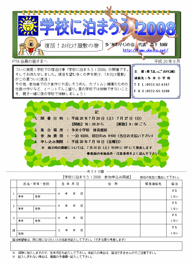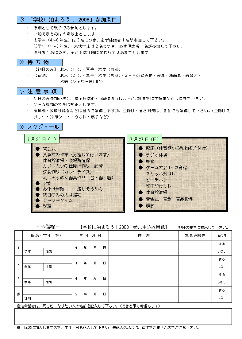 「学校に泊まろう! 2008」の参加者募集文書です。参加ご希望の方は、プリントアウトし内容記載の上、多米小の担任の先生宛てに提出をお願いします。